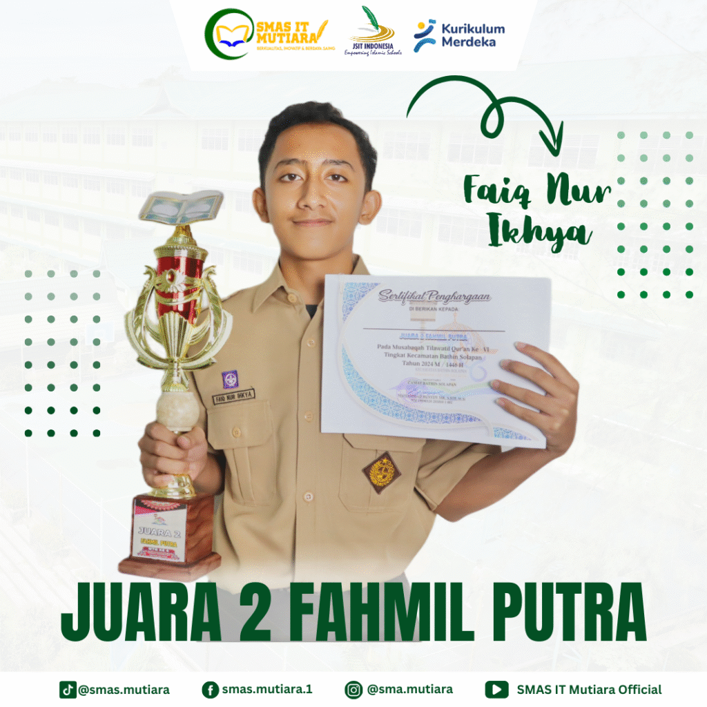 Alhamdulillah, kabar gembira kembali datang dari keluarga besar SMAS IT Mutiara Pinggir. Dalam ajang Musabaqah Tilawatil Qurâan (MTQ) Tingkat Kelurahan Bathin Solapan, siswa-siswi SMAS IT Mutiara berhasil menorehkan prestasi membanggakan di berbagai cabang lomba, membuktikan kecintaan dan kesungguhan mereka dalam mempelajari dan mengamalkan Al-Qurâan.